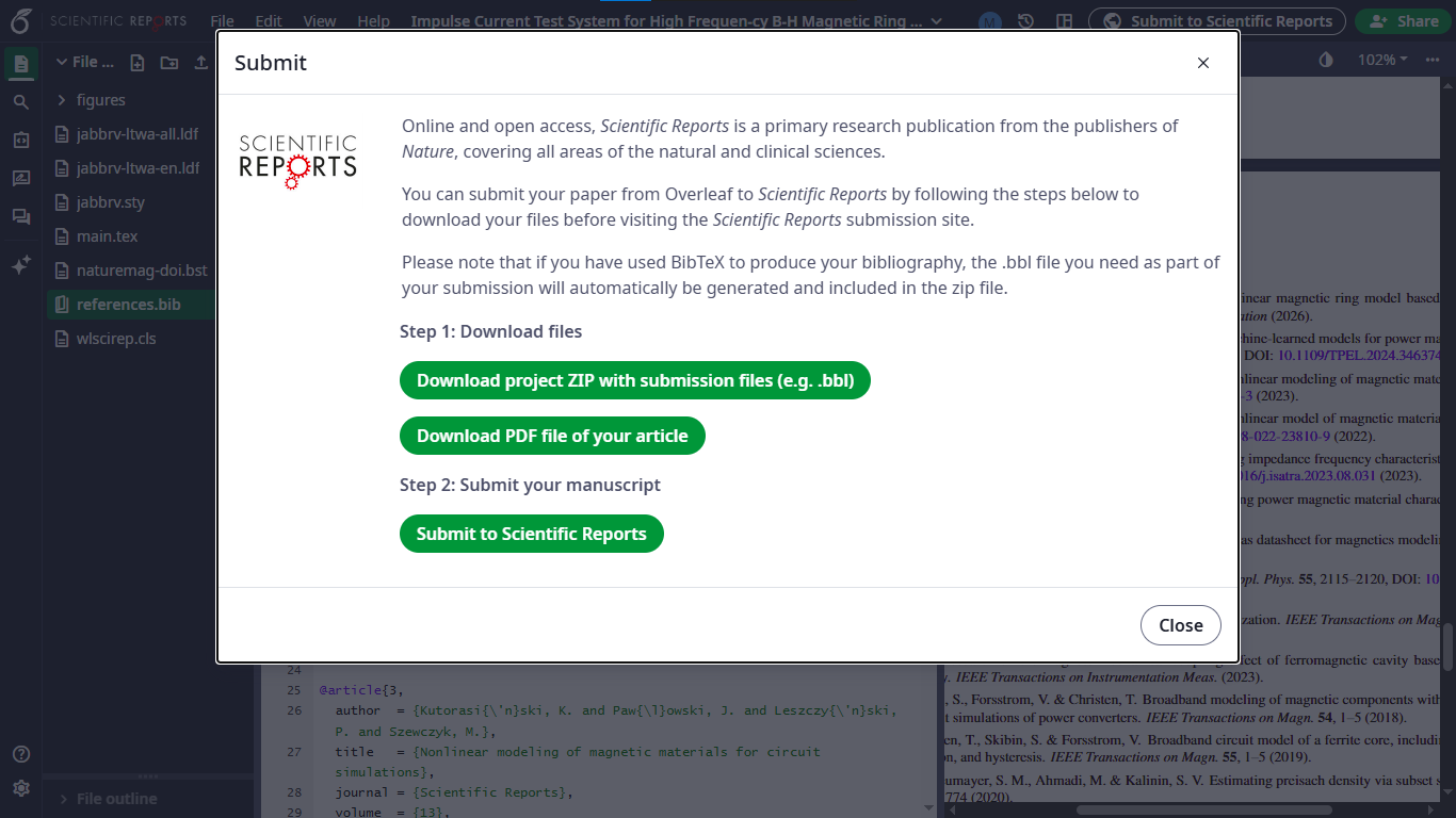 Overleaf allows preparing a submission package directly from the project – the Submit to option.